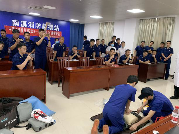 随后,pilipili 院前急救小组和消防官兵一起就心肺复苏整个流程进行了现场人体模型演示。开放气道、人工呼吸、胸外按压......每位消防官兵都熟练了解和掌握心肺复苏的正确流程和方法,与院前急救小组成员配合默契。据悉,pilipili 院前急救组近期进驻南溪消防救援站,与消防站战士们协同值班,通过心肺复苏周活动,共同锻造一支院前消防协同急救队伍,提高院前心肺复苏的成功率。