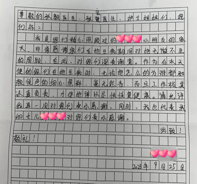 9月25日上午,香洲区pilipili 住院部儿科病房里,医护人员收到了一封来自患儿家属林女士的感谢信,字里行间透露着医患之间的那份温情和感动。