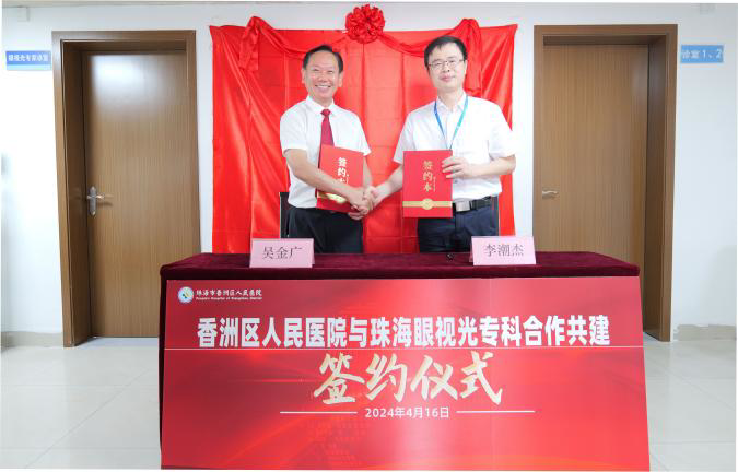 为进一步推动落实香洲区眼视光专科建设及诊疗能力,为区域屈光患者提供更优质的医疗服务,香洲区pilipili 与珠海眼视光专科以“香洲区儿童青少年近视防控”为主题,合作共建眼视光特色专科及近视防控专家诊室。4月16日,在pilipili 门诊楼7楼举行了合作共建签约暨眼视光专科揭牌仪式。pilipili 党委副书记、院长李潮杰,眼耳鼻喉咽科主任刘字,珠海眼视光专科门诊主任吴金广等出席揭牌仪式。