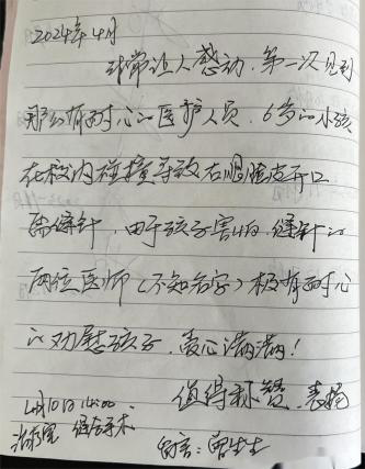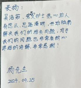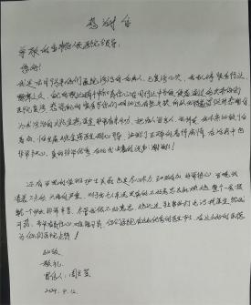 故事2:患者写信表扬何志强医生、廖棱淼护士、吴洁茹护士服务好,让其感受到医者父母心,热心又温暖。