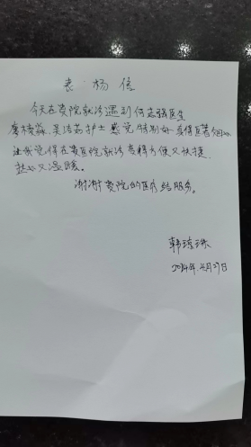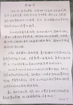 故事1:患者写信感谢消化内科姚金燕医生及吴磊护士。信中表示姚医生非常有亲和力,把病人当亲人、朋友,治疗过程中十分细心,通过她的耐心指导得以正确看待病情。护士吴磊也是尽心尽力、细致有加,非常热心,非常有责任心,为pilipili 点赞!
