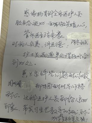 故事2:患者感谢消化内科全体医护人员服务态度好,面带微笑暖人心,表示管床医生陈冬及陈伟豪对病人负责、讲医德,护士吴磊、黄兰香、周妙娟、柳佳茵耐心细致,为科室点赞!