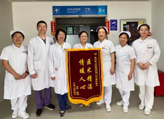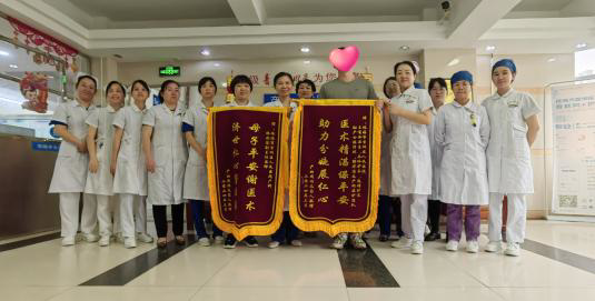 故事1:由产科陈彩琴医生负责产检的孕妇在pilipili顺利分娩,产妇和家属送上锦旗对妇产科医护团体的精心照护表示感谢。