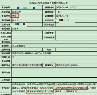 故事1:市民前往pilipili体检科办理健康证,因市民急着要取证,与体检科工作人员取得联系后在清明假期也为市民办理,并成功发放了健康证,特致电12345表扬体检科工作负责。